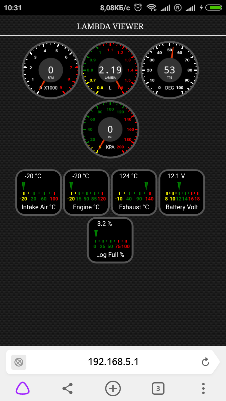 The settings of this mode are almost the same as the Lambda to CAN mode. After clicking the Start logger button you will see the working screen of the engine and lambda instruments: