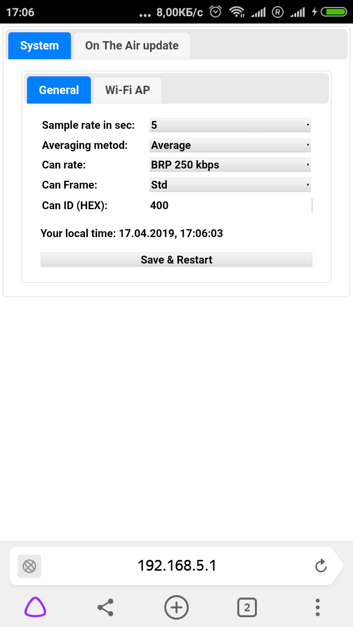Once all the settings have been made according to the protocol of your vehicle, click Save & Restart, the device will reboot to accept your settings and begin work on transferring the lambda data to the CAN bus. At the same time, the ERR LED flashes green, which means warming up the lambda. As soon as it stops flashing and glowing green, the lambda sensor is heated to the required temperature and the device transmits the correct data.